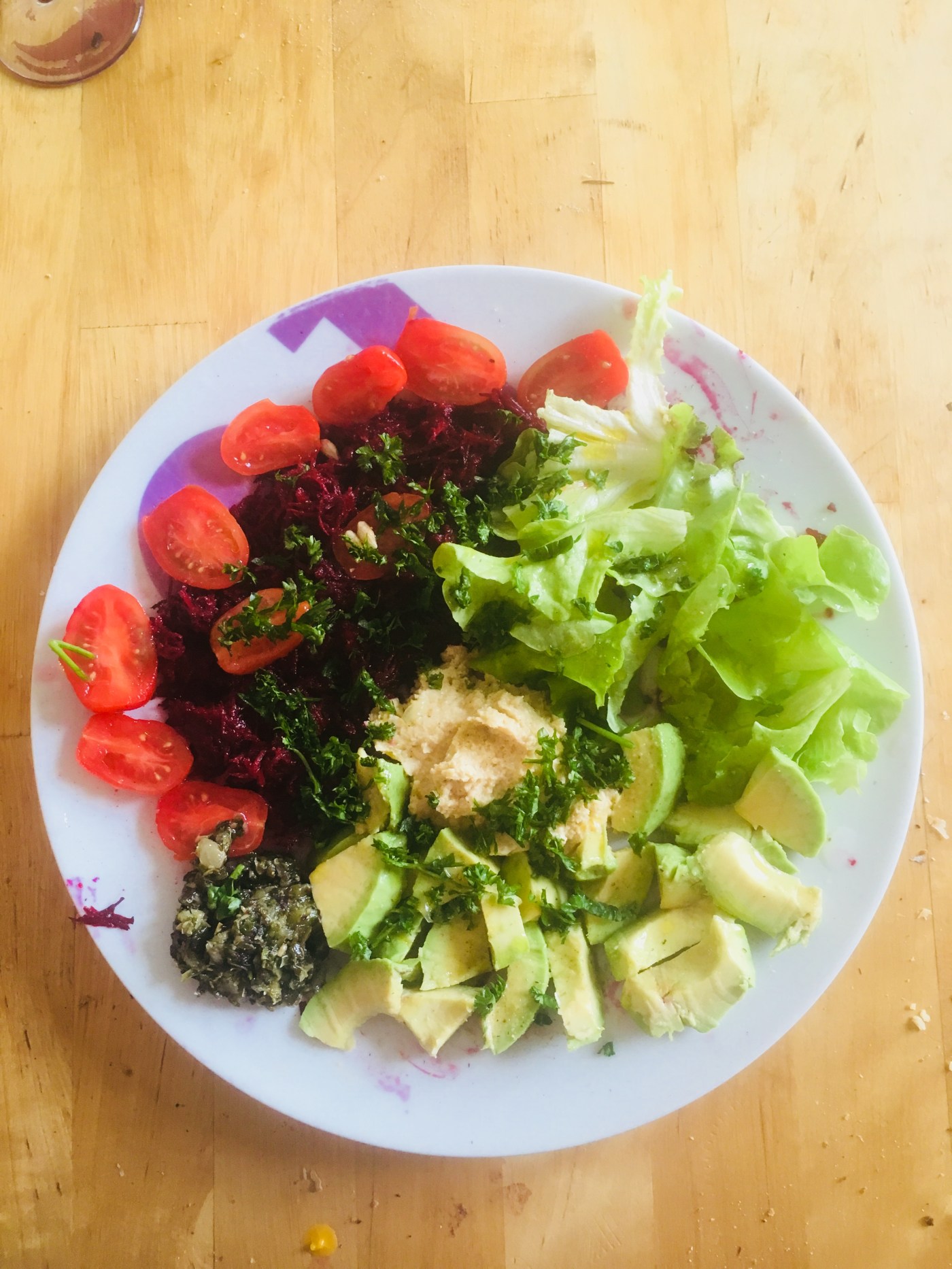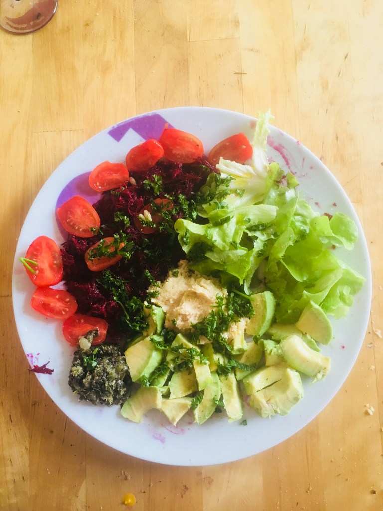 Estomac ; Une belle assiette comme sur la photo ce midi. Avocat, betterave crue, tartare d’algues, tomate, houmous et salade.