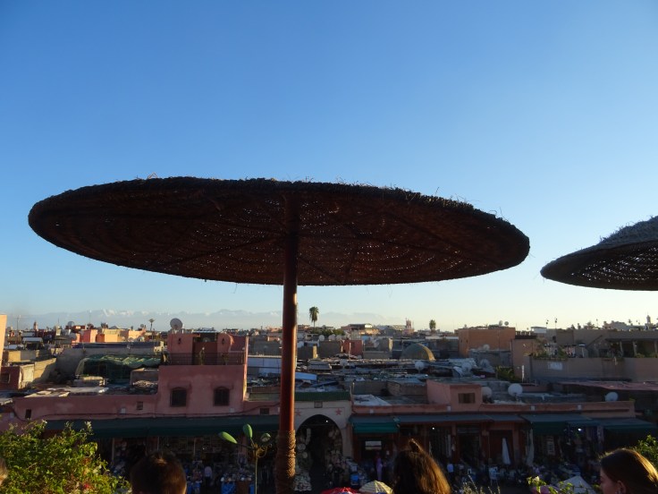 On arrive dans un grand et beau Riad voir luxueux. Là comme partout au Maroc, l’on est pris en charge par un homme charmant puis c’est la cérémonie du thé et des petits gâteaux associés au remplissage de la fiche touristique. On se laisse bercer par ce flot agréable. Le gentil monsieur nous dit que la chambre qui nous était destinée est prise et qu’il va nous mettre dans un autre Riad juste en face, plus luxueux encore pour le même prix…bon…et là on débarque dans un Riad carrément fantastique. La déco est un cocktail fabuleux franco-marocain, l’escalier est en marbre de toutes les couleurs et notre chambre, je ne sais même pas comment vous dire, c’est de toute beauté, un lit gigantesque, une déco style Werstern à la marocaine… Bref, c’est bien au-delà de toutes nos espérances. On est un peu surpris, mais bon… on se dit que Guest to Guest ( échange de maison ) c’est vraiment chouette et qu’on reviendra…on pose nos bagages, on monte sur la terrasse… Ah les terrasses de Marrakech , j’en rêve toute l’année… baignées de soleil, elles surplombent la ville et les montagnes de l’atlas enneigé. Je vous laisse imaginer le p’tit déj toujours très raffiné… c’est une des spécificités de Marrakech que j’affectionne particulièrement. Donc nous voici sur une terrasse immense s’extasiant sur la beauté du Riad puis on part se balader dans la médina. On rentre quelques heures plus tard, heureux de retrouver notre havre de paix et de beauté. Dans la chambre, je ne sais pas pourquoi je commence à avoir un gros doute, peut-être parce que je ne m’autorise pas ce genre de luxe là, je me dis que c’est vraiment trop classe et qu’il doit y avoir une erreur. Et si on s’était trompé de Riad, personne n’a rien vérifié, on n’était pas sur… On regarde sur internet et le doute s’amplifie en voyant que ce Riad n’est à priori pas au même endroit que celui que nous avions réservé. On descend à la réception pour faire part de notre doute, le type me demande si je suis « Catherine », ben oui c’est moi, mais a priori le nom n’est pas le même. Et ben voilà, on y est , c’est pas là ! Snif…snif… Là le patron arrive fâché et nous fait accompagner dans notre Riad qui en effet est beaucoup plus simple. J’avoue que j’ai eu du mal à m’en remettre, il m’a fallu 2 jours avant que les images de l’autre cessent de me harceler, il était tellement beau… On s’est bien marré, mais heureusement qu’on à pas eu à payer, c’était une fortune ! la bonne blague…C’était juste notre arrivée à Marrakech…