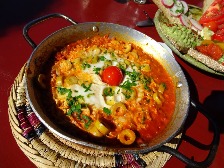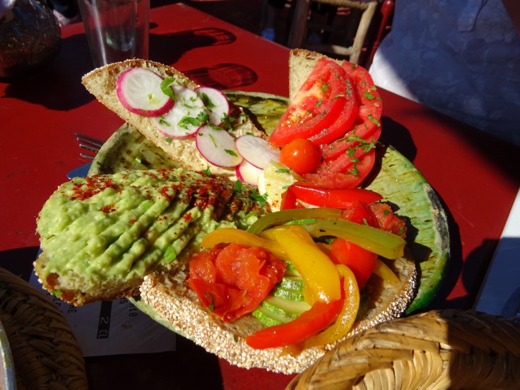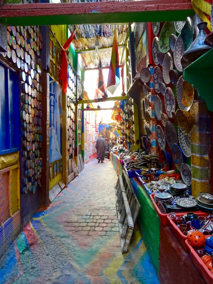 Puis, y’a la médina, toujours la médina. On a été chanceux. Au moment où nous nous lancions à l’assaut de la médina, nous avons croisé Laurent, le français chez qui nous habitions qui nous a gentiment guidés. On a commencé par les ferronniers, puis le travail du bois, du cuivre, les tapis, tout cela dans une ambiance tout à fait tranquille avec beaucoup de partage et d’amitié. J’ai fini ce circuit avec un joli bracelet et un encore plus beau tapis turquoise qui m’a fait craquer. Puis les échoppes d’alimentation…