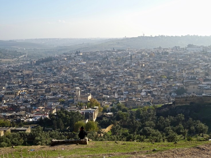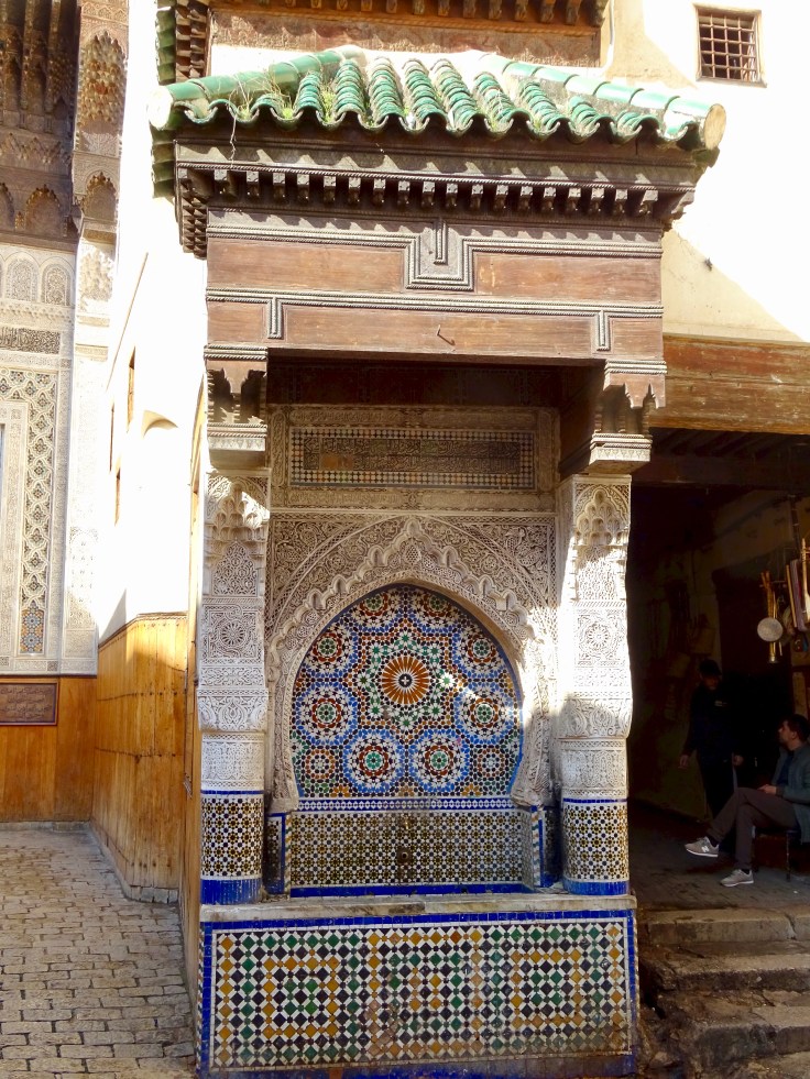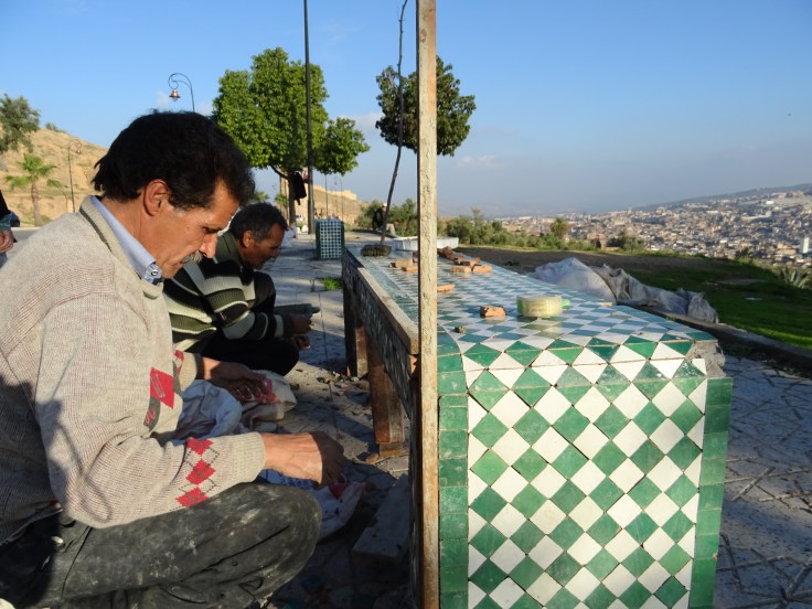Fès est plus traditionnel que Marrakech, mais comme les avions low cost y arrivent aussi directement, elle fourmille de touristes mêmes en basse saison et donc de rabatteurs en tout genre, qui on vous le répète, n’hésiterons pas à vous prendre la tête…mais j’avoue qu’elle à son charme et puis il faut dire que Samira, notre hôte a été particulièrement attentive et adorable avec nous. Un vrai délice est de monter en fin de journée au tombeau des Mérinides sur une des collines qui entourent Fès. On y découvre une vue grandiose sur la ville et sa médina. Les Marocains et Marocaines s’y rendent beaucoup pour se détendre. Nous avons particulièrement apprécié la descente du retour vers la médina. Une belle rencontre avec des artisans qui décoraient les bans en Zellige ( un style de mosaïque marocaine qui vient de Fès ). Un vrai bonheur de les voir tailler puis poser un par un les petits carreaux vert et blanc avec une attention exquise. C’est tellement bon de sortir de l’industriel et du rythme effréné de nos pays occidentaux puis ensuite de regarder, assise sur une de ces bancs justement les cueilleurs d’olives perchés dans les arbres et les femmes qui les ramassent au sol… là, aucun rabatteur, de vrais échanges…
